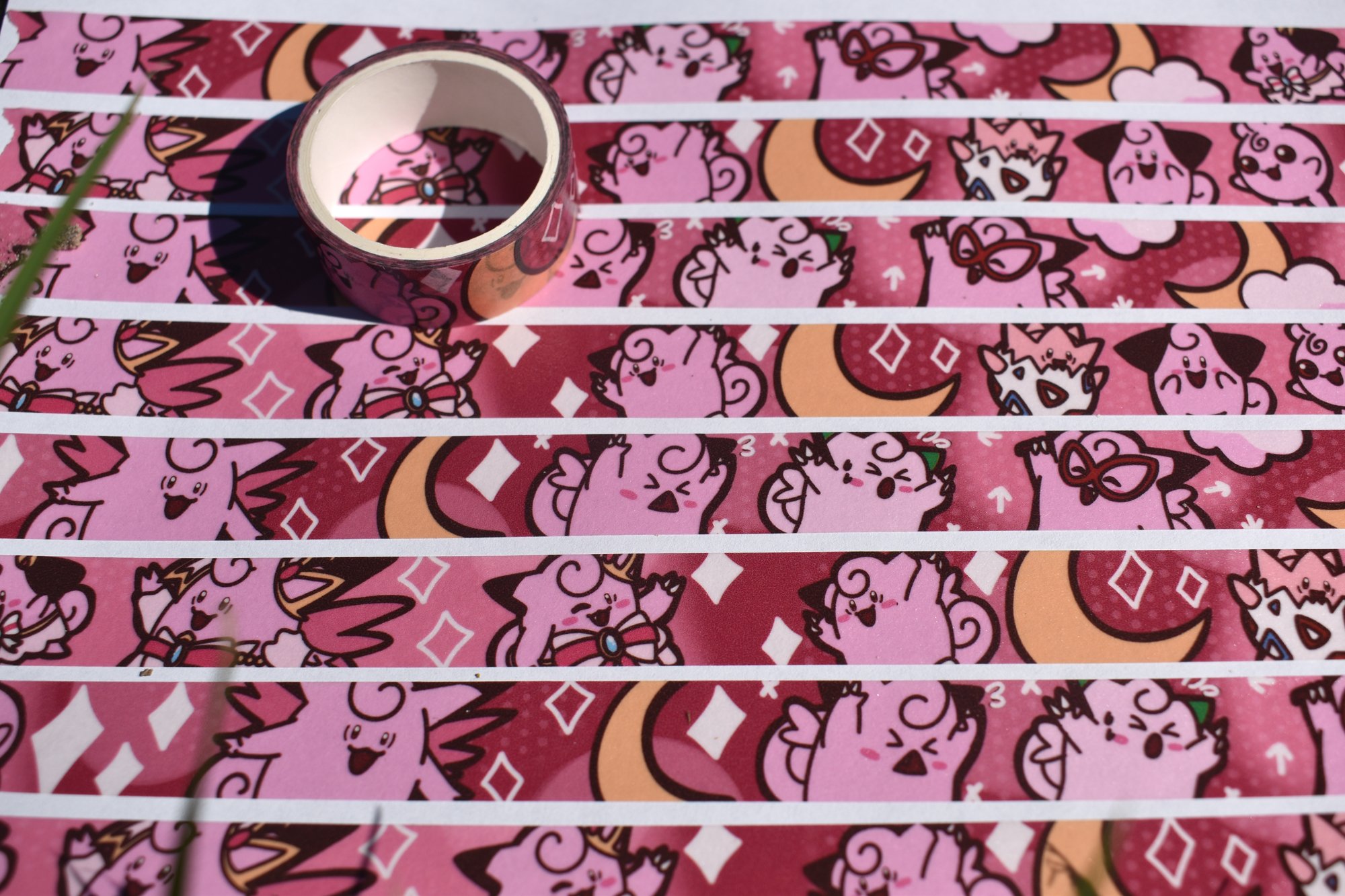 Washi tape featuring Cleffa, Clefairy, Clefable, Igglybuff, and Togepi Tape measures 1.5cm by 5m (~0.6" by ~16.4')