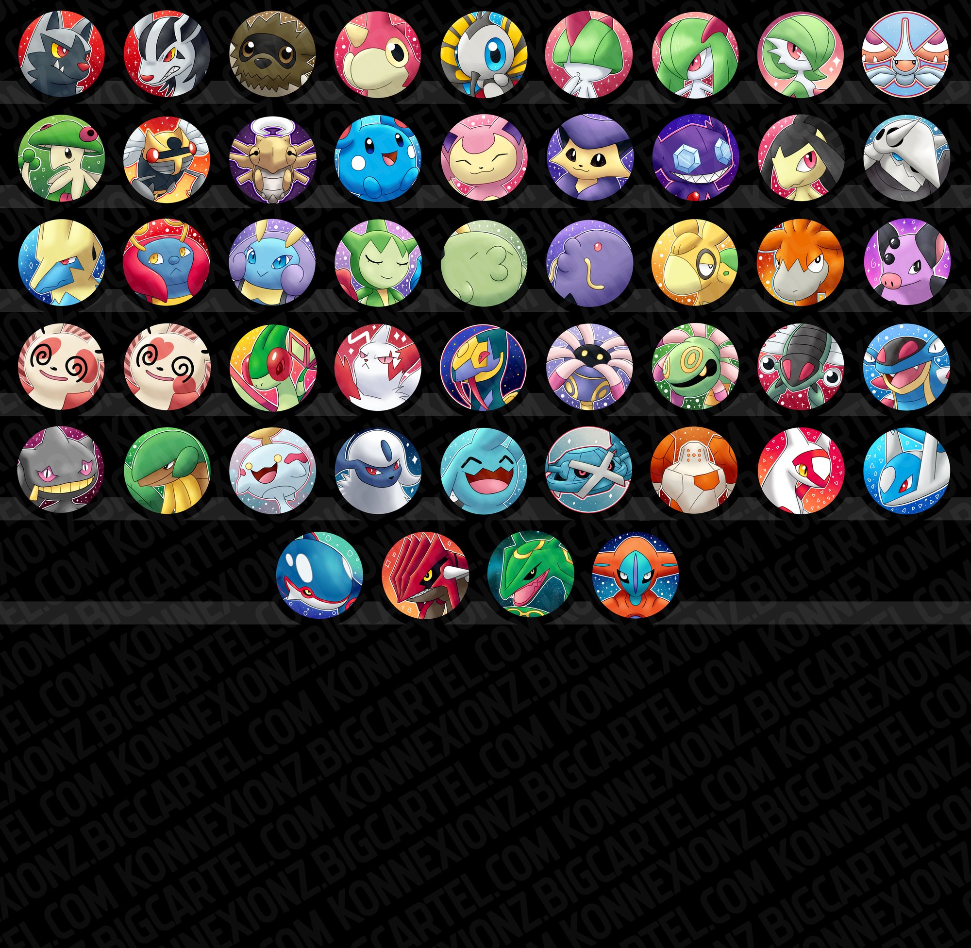 Charizard, Caterpie, Butterfree, Pidgey, Pidgeotto, Pidgeot, Spearow, Fearow, Arbok, Pikachu, Nidoran (Female), Nidoran (Male), Ninetales, Wigglytuff, Growlithe, Arcanine, Ponyta, Gastly, Gengar, Exeggutor, Goldeen, Scyther, Lapras, Eevee, Vaporeon, Jolteon, Flareon, Porygon, Articuno, Zapdos, Moltres, Dragonair, Dragonite, Mewtwo, Meganium, Quilava, Typhlosion, Totodile, Feraligatr, Furret, Crobat, Xatu, Lanturn, Igglybuff, Togepi, Mareep, Ampharos, Skiploom, Sunkern, Espeon, Umbreon, Murkrow, Wobbuffet (Male), Wobbuffet (Female), Girafarig, Dunsparce, Steelix (Male), Steelix (Female), Granbull, Scizor, Heracross, Sneasel, Skarmory, Houndour, Houndoom, Smeargle, Magby, Miltank, Raikou, Entei, Suicune, Tyranitar, Lugia, Ho-oh, Celebi, Treecko, Grovyle, Sceptile, Torchic, Blaziken, Swampert, Poochyena, Mightyena, Zigzagoon, Wurmple, Beautifly, Ralts, Kirlia, Gardevoir, Masquerain, Breloom, Ninjask, Shedinja, Azurill, Skitty, Delcatty, Sableye, Mawile, Aggron, Manectric, Volbeat, Illumise, Roselia, Gulpin, Swalot, Numel, Camerupt, Grumpig, Spinda, Flygon, Zangoose, Seviper, Lileep, Cradily, Anorith, Armaldo, Banette, Tropius, Chimecho, Absol, Wynaut, Metagross, Regirock, Latias, Latios, Kyogre, Groudon, Rayquaza, Deoxys,